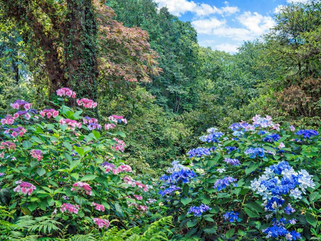 Présents pendant de longs mois, hydrangeas et hortensias composent de véritables tableaux impressionnistes. En automne, dans le vallon rouge, les érables du Japon offrent des couleurs flamboyantes spectaculaires dans ce jardin remarquable de Normandie.