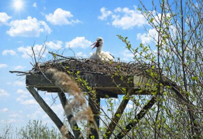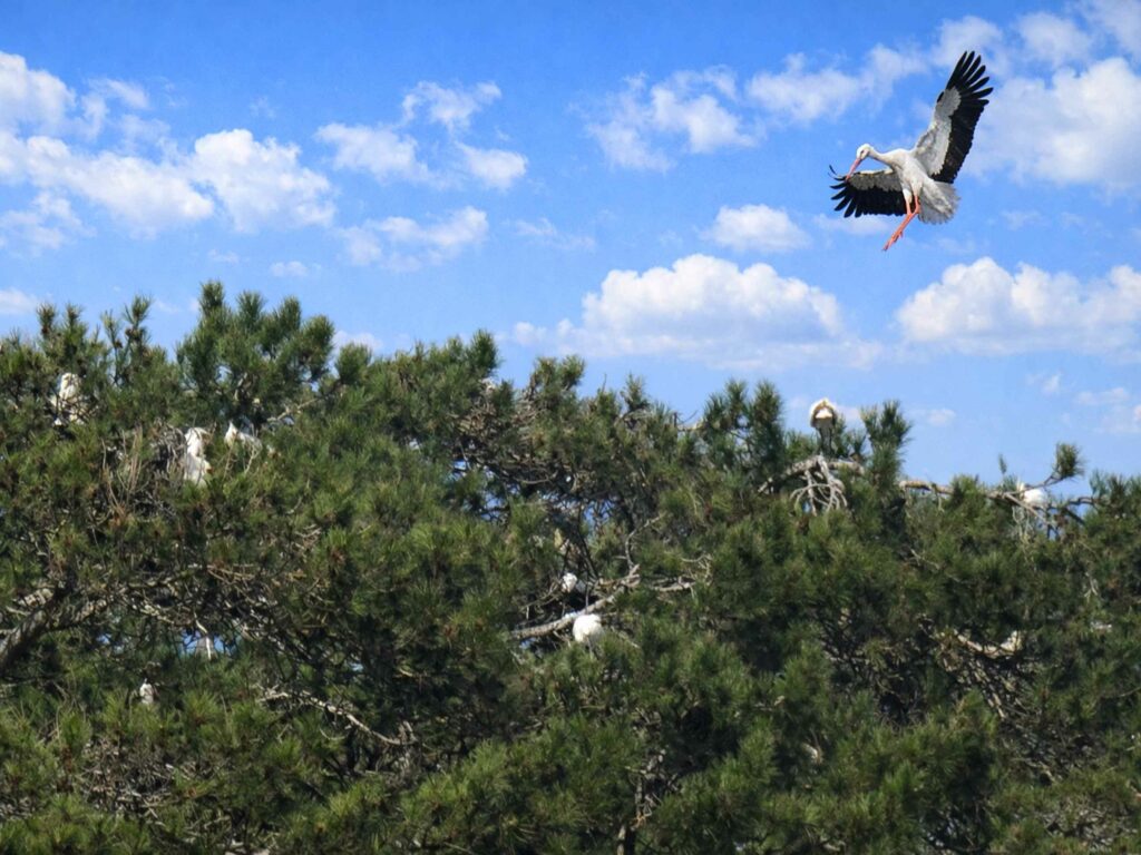 De mi-février à juillet, la héronnière accueille plusieurs espèces majestueuses : le Héron cendré, le Héron garde-bœuf, l’Aigrette garzette, la Spatule blanche et la Cigogne blanche