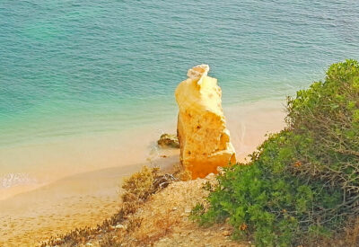 Cette plage est située près du village de Carvoeiro. Un parking gratuit près du Club Atlântico facilite l’accès à cette plage préservée du Portugal. Un court sentier mène à un tunnel creusé dans la falaise, marqué par des fossiles marins. Ce tunnel naturel débouche sur une plage aux eaux turquoise emblématiques de l’Algarve.